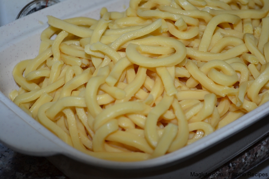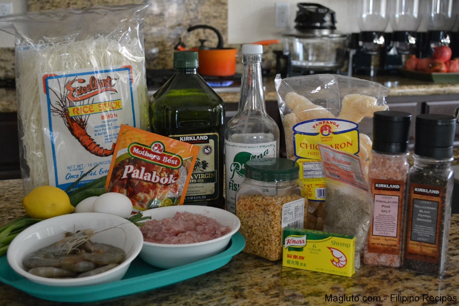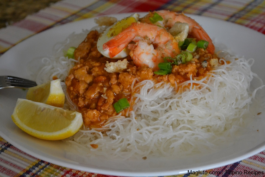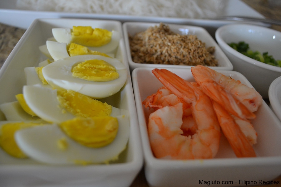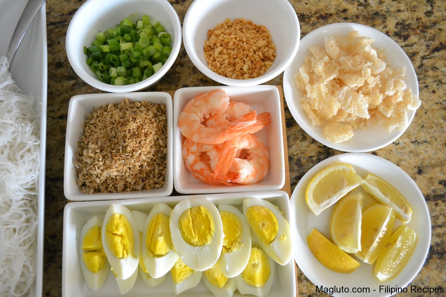 Place noodles onto serving plate. Spoon sauce over noodles and top with shrimp, chicharon, tinapa flakes, eggs, toasted garlic bits and green onions.