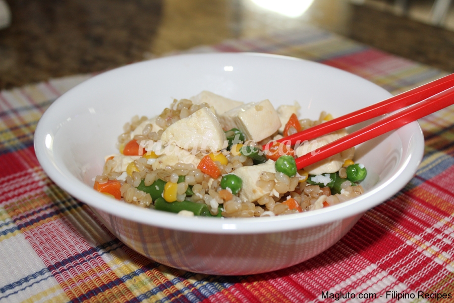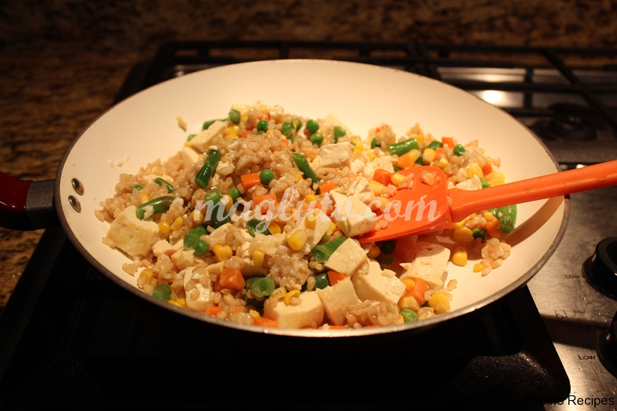 3. Use the same skillet to mix the brown rice, mixed vegetables and tofu.