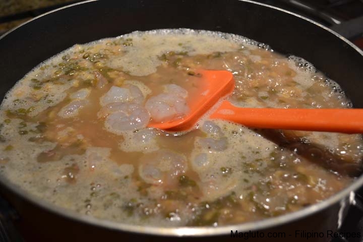 2. Add water and the shrimp bouillon. Simmer for 3 minutes.