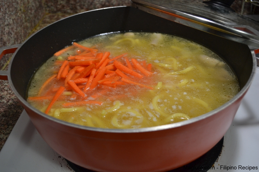 5. Then add the noodles and carrots. Simmer for 3 minutes.