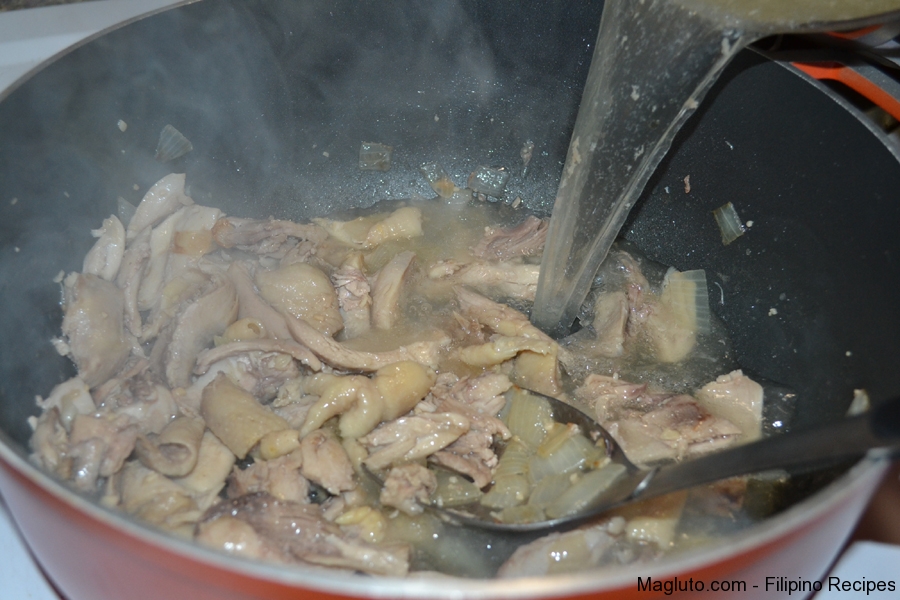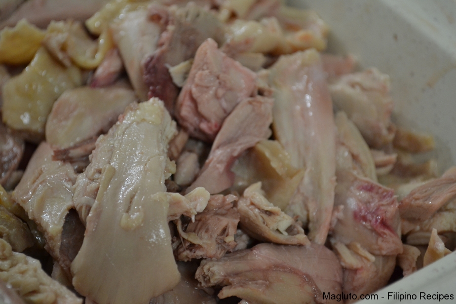 1. In a pot, boil chicken until tender. Slice the boiled chicken. Set aside the broth.